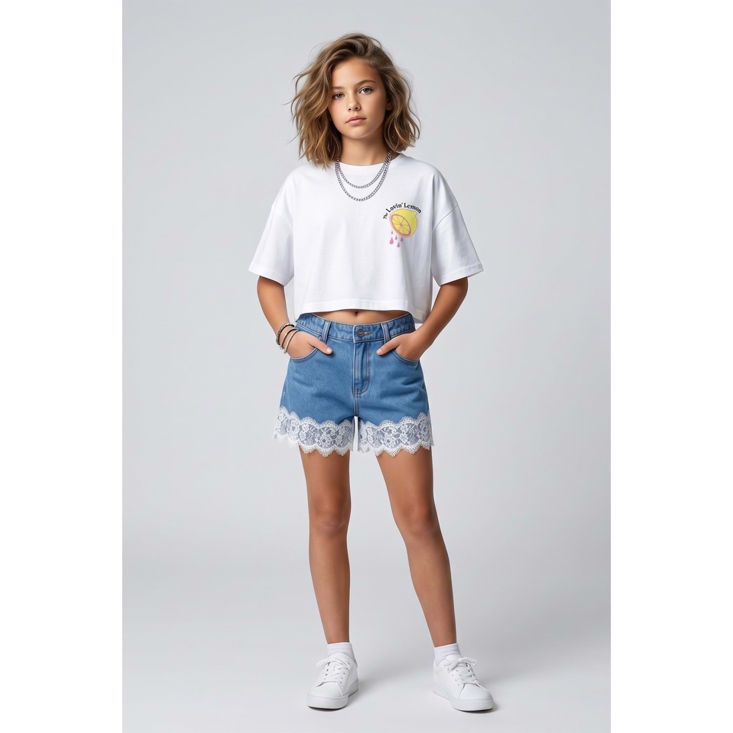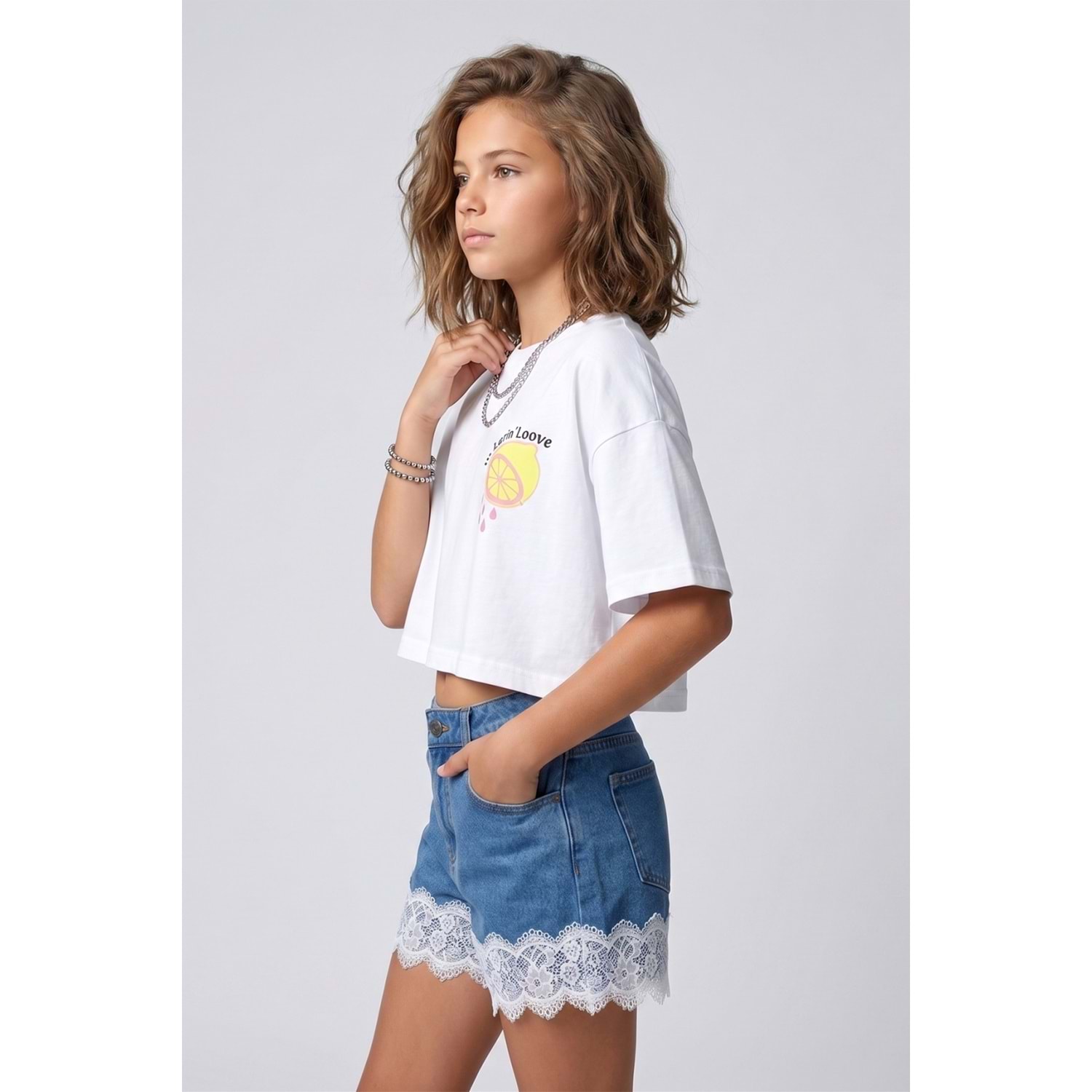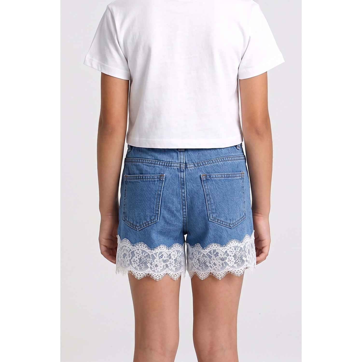 0780 ÇOCUK PAÇA UCU DANTELLİ BELDEN AYARLI KOT ŞORT
