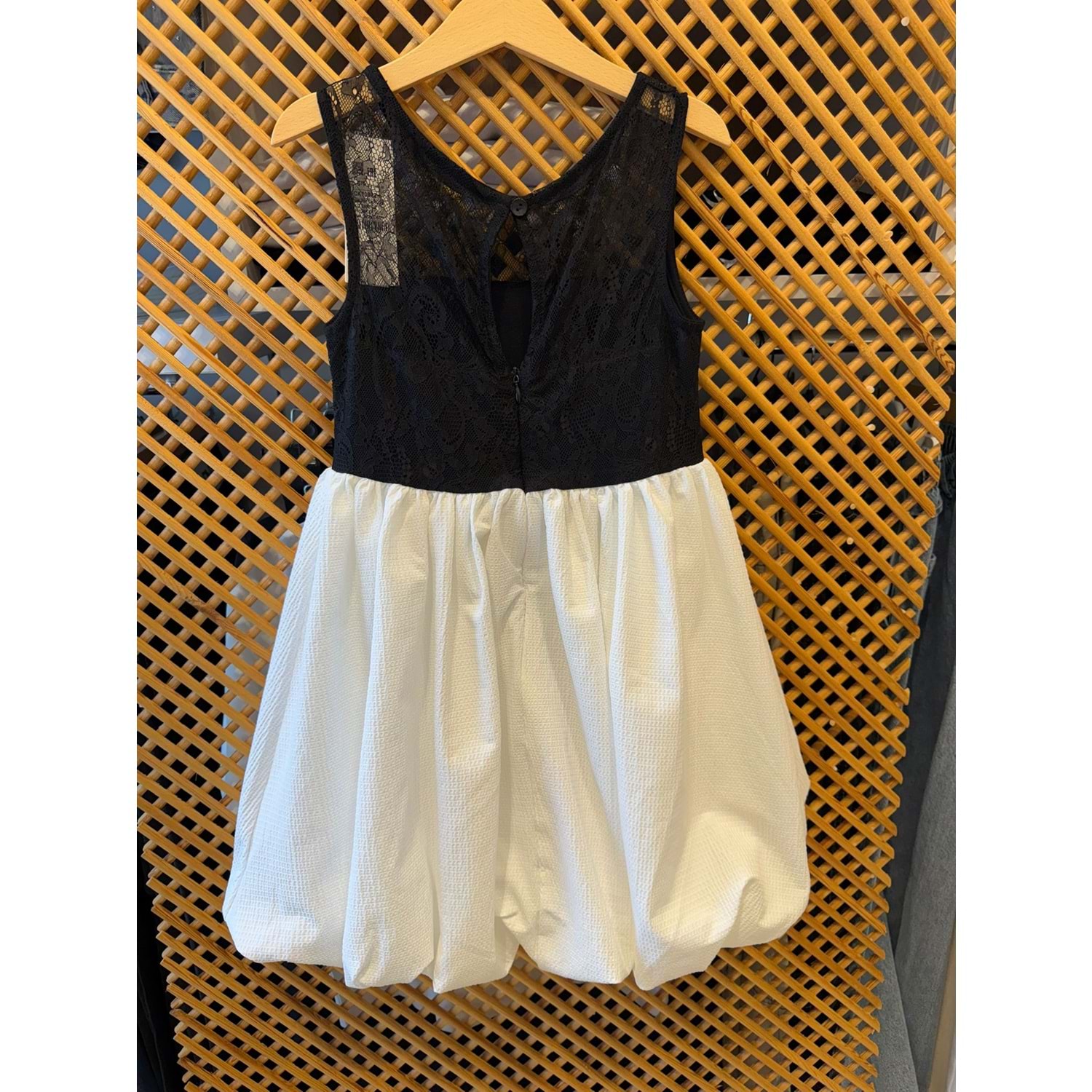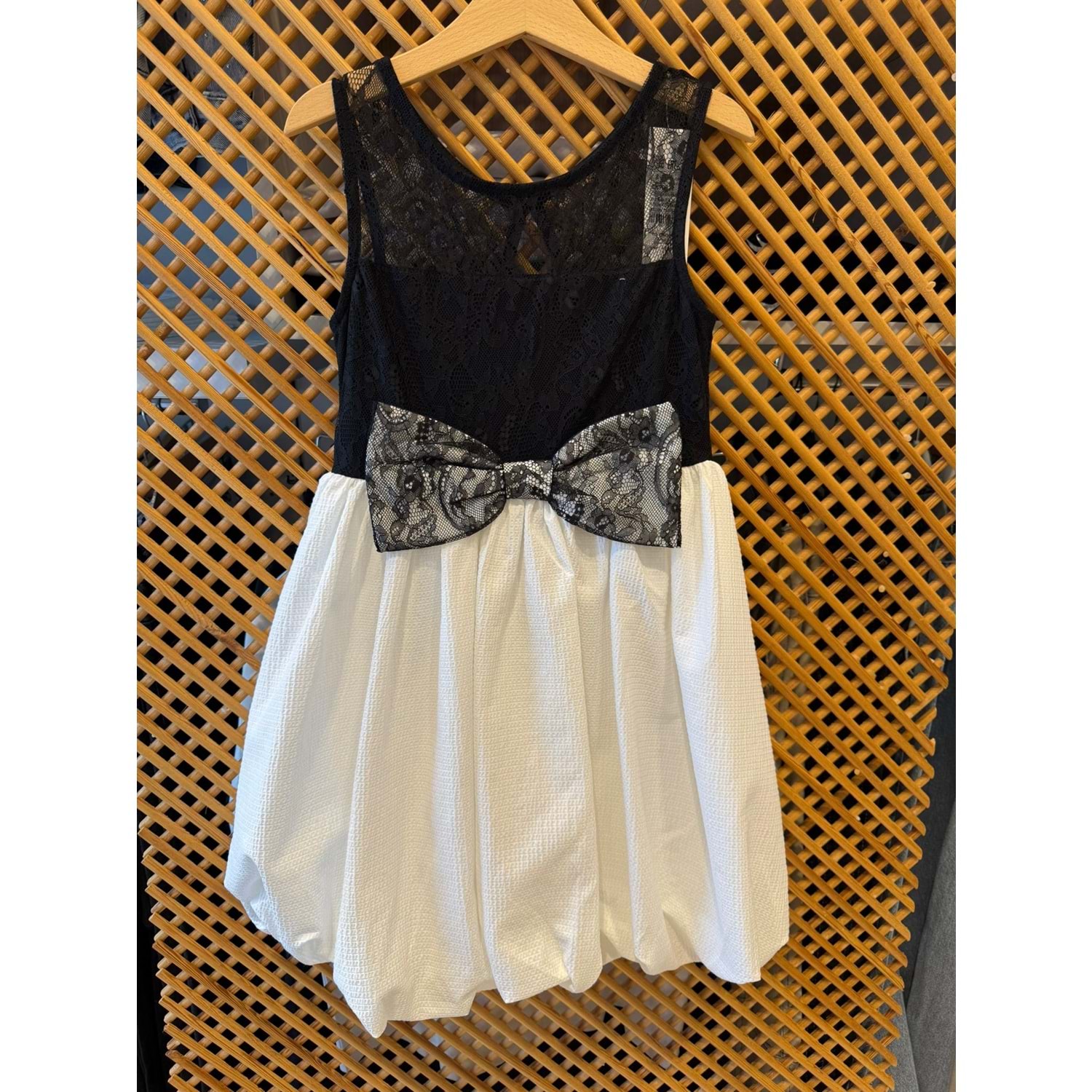 70822 ÇOCUK BEDENİ DANTEL VE FİYONK DETAY BALOK ETEK KOLSUZ ELBİSE