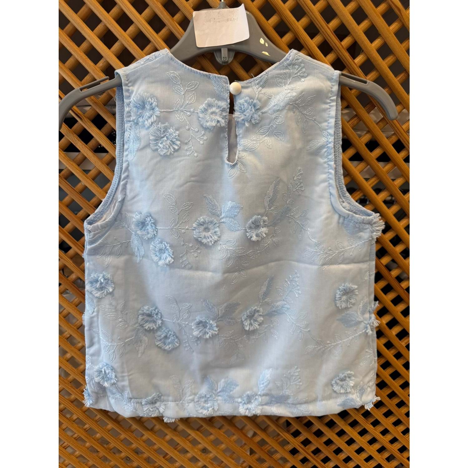 2323 ÇOCUK ÜÇ BOYUTLU NAKIŞLI KUMAŞ KOLSUZ BLUZ