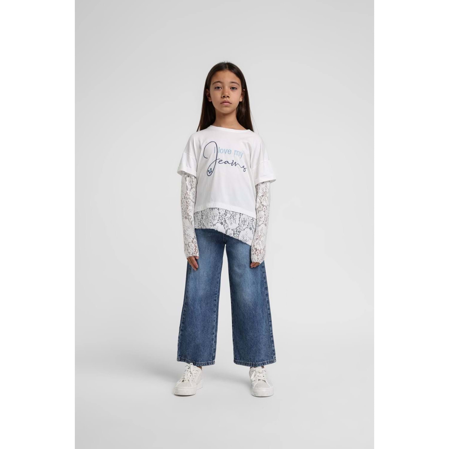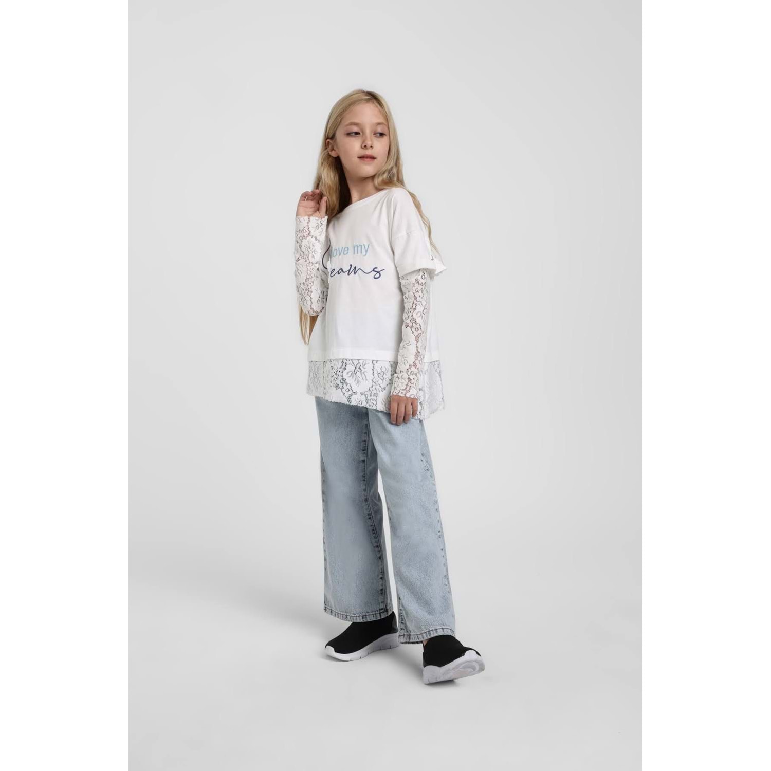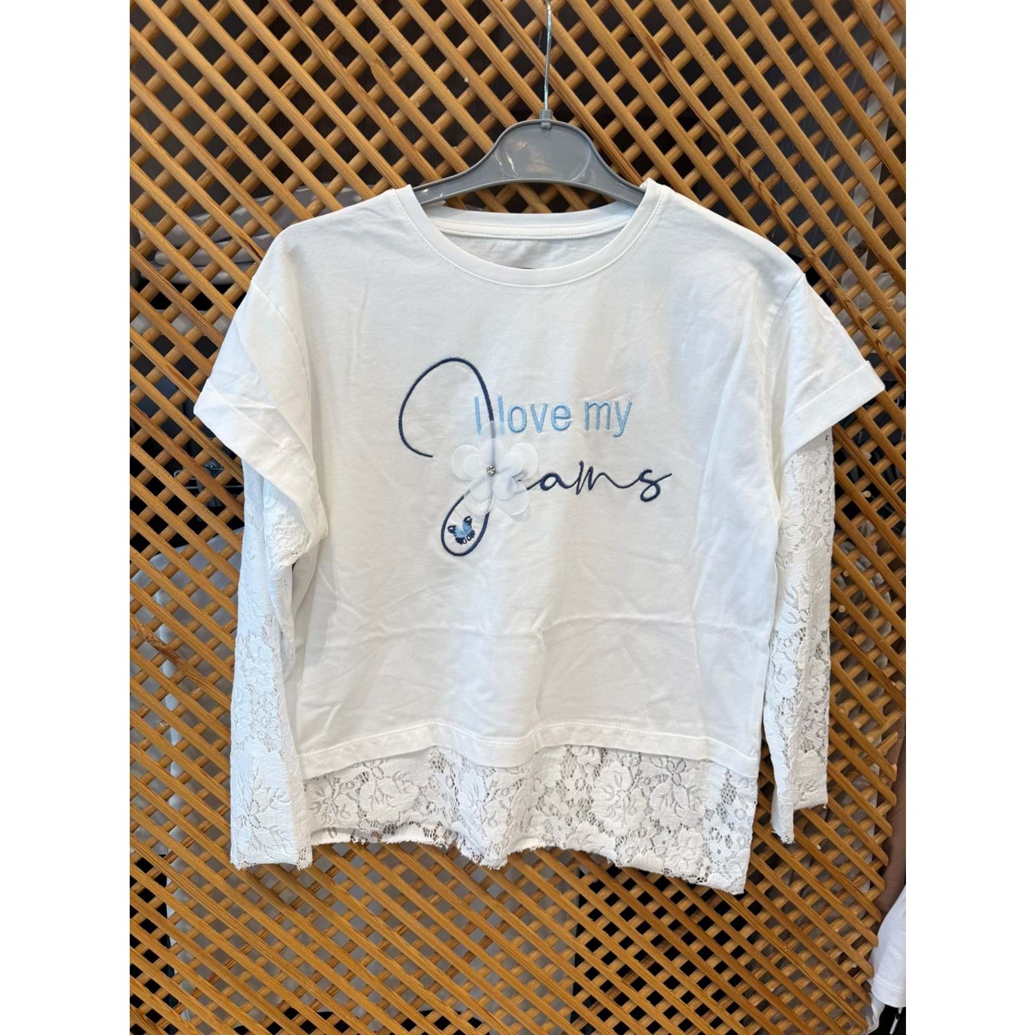 36195 ÇOCUK PAMUKLU KUMAŞ KOL VE ETEK UCU DANTELLİ TİŞÖRT