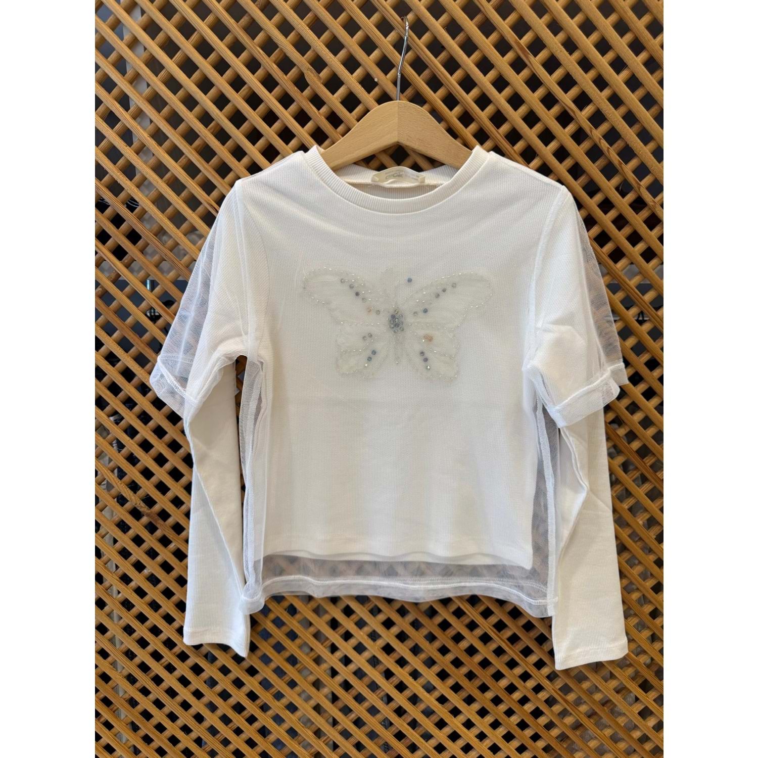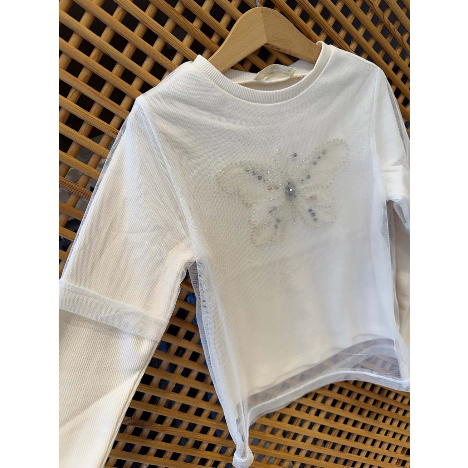 75847 ÇOCUK ÖNÜ TAŞLI KELEBEK ÜSTÜ KISA KOL TÜL DETAYLI ÇİFT KAT BLUZ